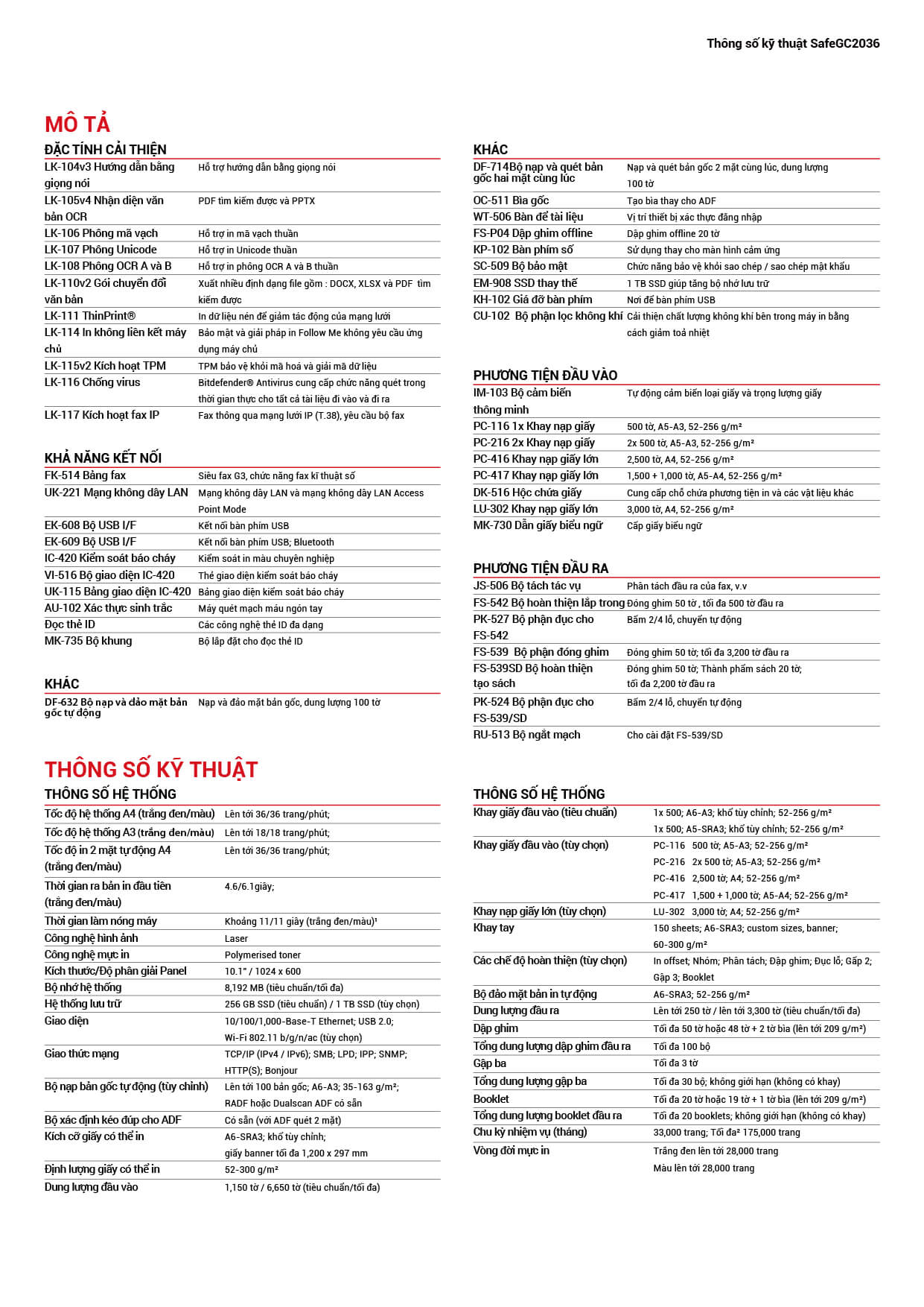 | Tốc độ đầu ra (A4 ngang) | Đen trắng: 36 tờ/ phút Màu: 36 tờ/ phút | |