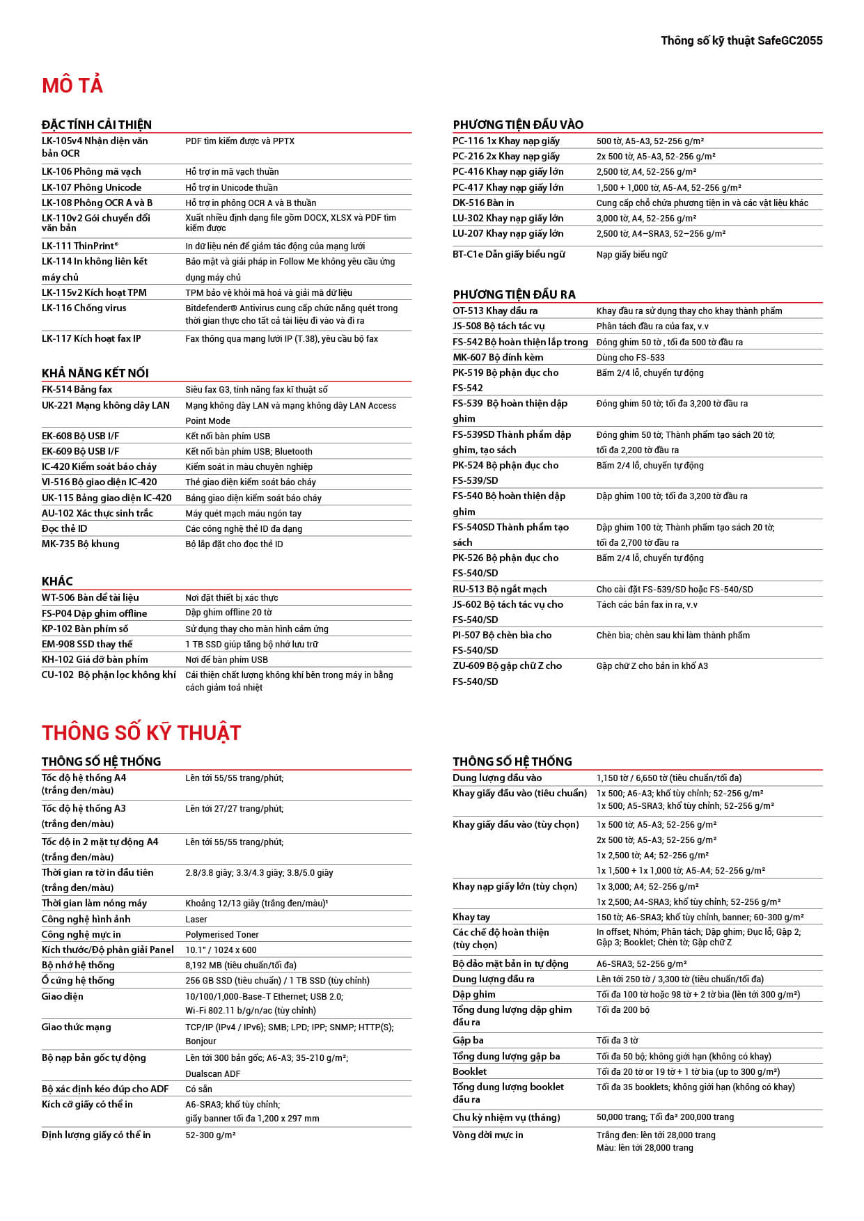 | Tốc độ in (A4 ngang) | Đen trắng:55 trang/phút Màu:55 trang/phút | |